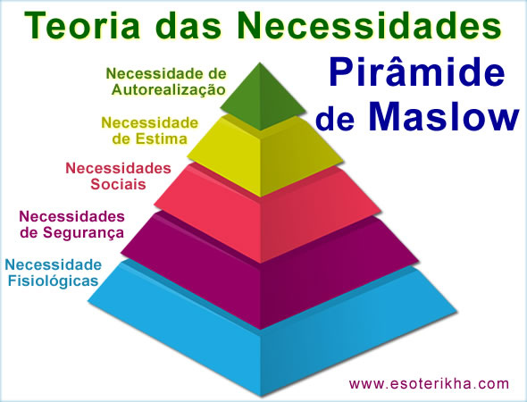 Para o psicólogo norte-americano Abraham Maslow (1908-1970), adepto da psicologia humanista, a motivação está diretamente ligada à satisfação de necessidades; sua proposta de hierarquia de tipos de necessidades, conhecida como Pirâmide de Maslow, pode ser resumida assim: